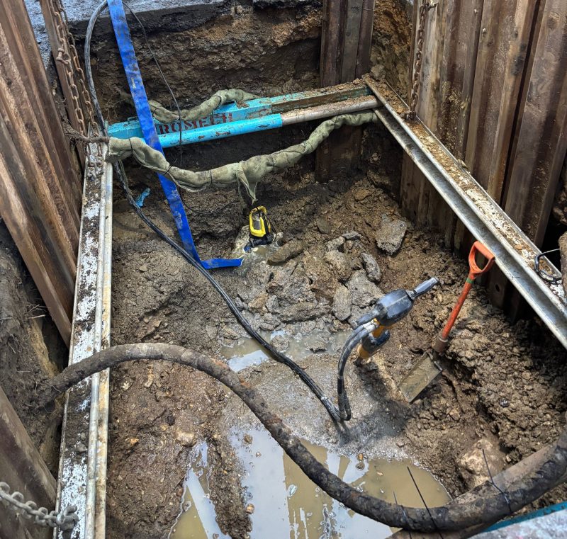The repair involved accessing a section of foul sewer located within the trees’ Root Protection Areas. While a no-dig solution was initially explored, the condition of the sewer meant an open excavation was required to complete the repair safely and effectively.